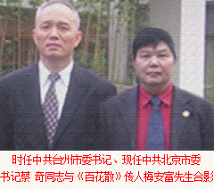 全國(guó)政協(xié)副主席、中共中央委員、中國(guó)殘聯(lián)主席鄧樸方先生與鄭州臺(tái)州商會(huì)支部書記兼秘書長(zhǎng)、《百花散》傳人梅安富先生親切交談鄭州市腫瘤康復(fù)協(xié)會(huì)名譽(yù)會(huì)長(zhǎng)。2005年5月,作為臺(tái)州古代中醫(yī)秘方梅氏《百花散》